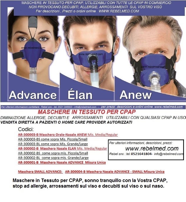 Kit con Maschera in tessuto per Cpap mod. Elan MIS Piccola/Small, maschera con fissaggio laterale per consentire, quando indossata, la lettura, visione TV e altre attività quotidiane. Prezzo riferito al singolo Kit, connettore girevole di 360°. Quando viene accesa la CPAP o BiPAP, il bordo della maschera immediatamente si gonfia fino a formare un cuscinetto morbido e senza perdite. Non contenendo materiale plastico, non provoca decubiti o fastidiosi arrossamenti, EVITA punti di pressione che possono provocare fastidiosi arrossamenti sul viso. Inoltre non intralcia la Vostra visuale, indossata permette di leggere, guardare la TV o indossare gli occhiali anche durante la Vostra Terapia. il KIT è COMPRENSIVO di: Maschera misura media BLU, nucale e istruzioni d'uso. Prezzo relativo a 1 KIT. Disponibili in altri colori a richiesta. Utilizzabili con tutte le Cpap in Commercio