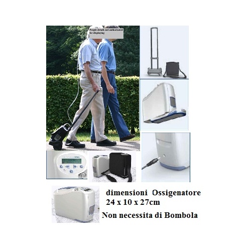 concentratore ossigeno, portatile NON necessita di bombola per funzionamento, funzionamento a batteria o rete 220V, utilizzabile sia a posto letto, domicilio, viaggio, grazie alla batteria in dotazione. fornito con batteria per funzionamento in mancanza di connessione 220V o in caso di spostamento, viaggio, vacanza. la confezione comprende: batteria ricaricabile(circa 8 ore di utilizzo), carrello, alimentatore/carica Batteria, Borsa per trasporto a tracolla, manuale d'uso. Il prezzo comprensivo di 1 confezione come sopra. Disponibile con batteria di 4 ore
